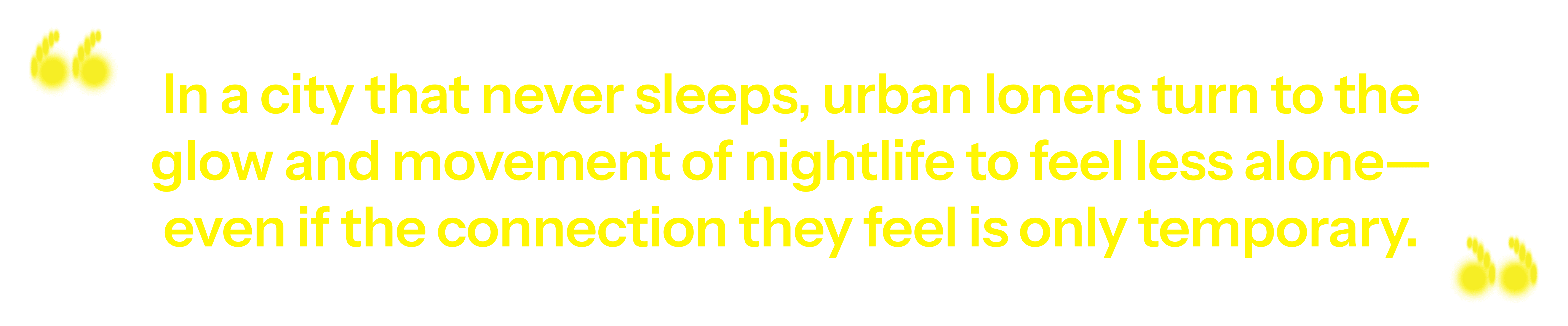 This kinetic typeface is created for the often-forgotten urban loners. In a bustling nocturnal city, thousands live with loneliness, depression, and isolation—finding quiet comfort in the glow of city lights and the busy yet calming movements of urban life.